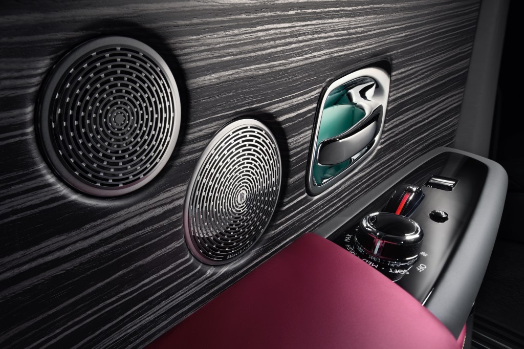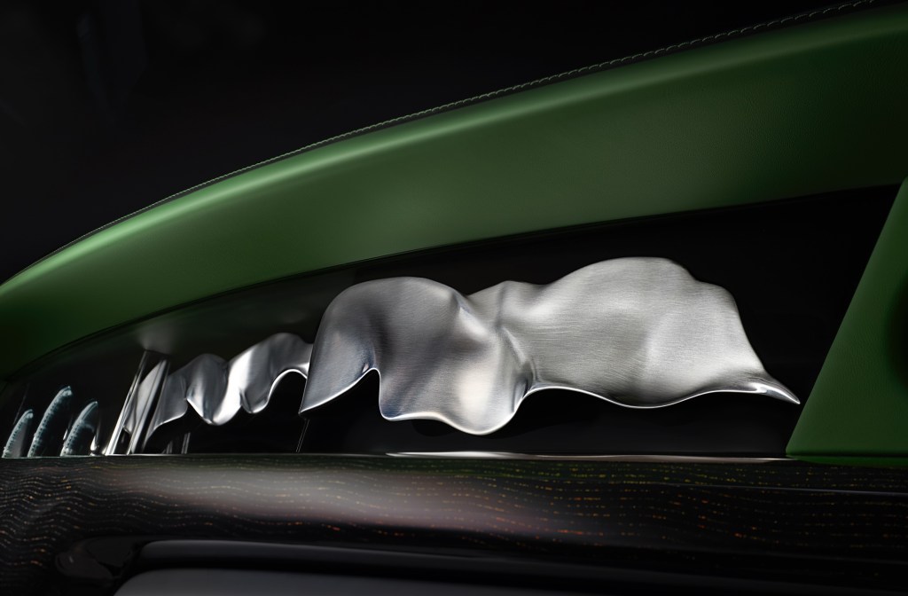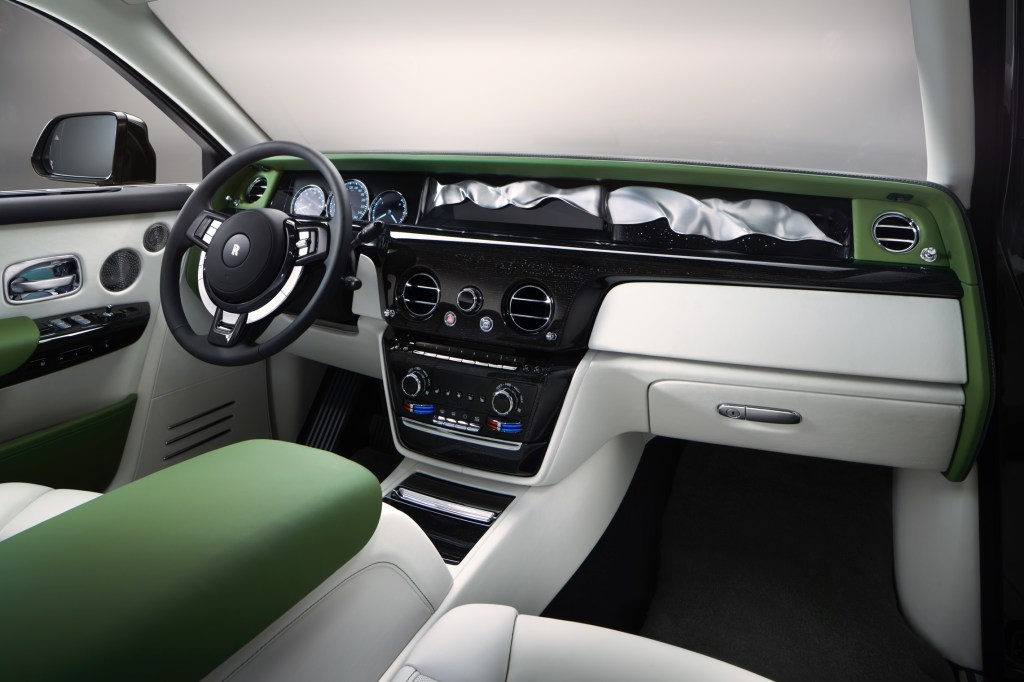 兩種織料都呈現了以歡慶女神圖案為基礎的花紋。在絲綢織料中,該花紋設計較小,絲織入裡,營造極為強烈的視覺效果。同時,在如扶手、中控台以及在 Phantom 車系獨有的藝境藏珍畫廊的視線可及處,均有花紋裝飾。