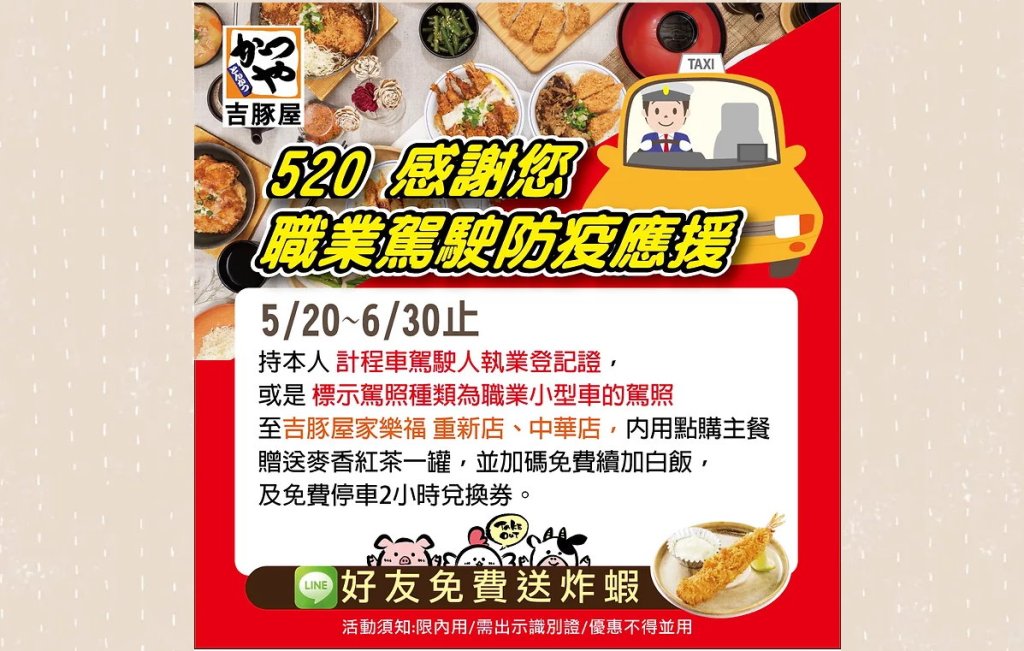 520不僅是個另類情人節,更是個充滿感謝的日子!大街小巷可見的職業司機們在防疫期間默默付出,不論是防疫車隊或是協助配送關懷包,可說是無名英雄!為感謝這群堅守崗位付出的辛苦司機們,吉豚屋自5/20-6/30舉辦元氣應援職業司機活動,凡本人持計程車駕駛人執業登記證,或是標示駕照種類為職業小型車的駕照,至吉豚屋家樂福重新店、家樂福中華店,點購主餐任一份贈送麥香紅茶一罐,若自備環保杯,吉豚屋再奉上日式無糖健康麥茶,內用加碼任點主餐一份即享免費續加白飯,此外,司機們也無須擔心需要花錢停車,吉豚屋提供免費停車2小時兌換券,就是要讓辛勞的司機們能安心休息,吃飽喝足採購必需品,補充元氣再出發!