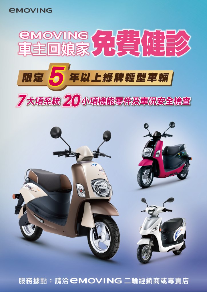 不讓四輪健檢專美於前,eMOVING為照護車主,推出「eMOVING車主回娘家免費健診」,即日起至2022年12月31日止,凡2017年底前領牌(五年以上)之綠牌輕型車輛,即可預約至全台eMOVING二輪經銷據點,免費提供愛車7大項20小項健檢服務,提升車輛使用安全與保障。