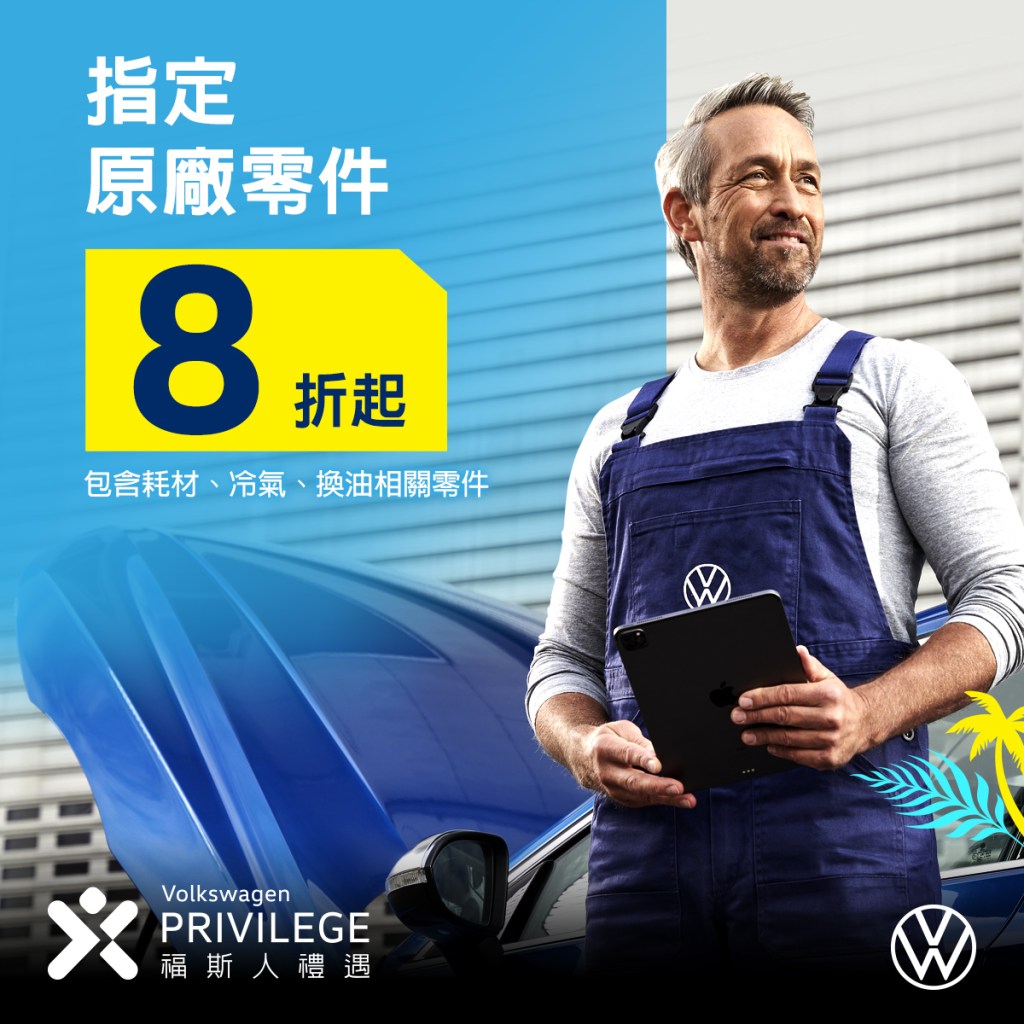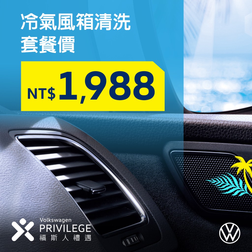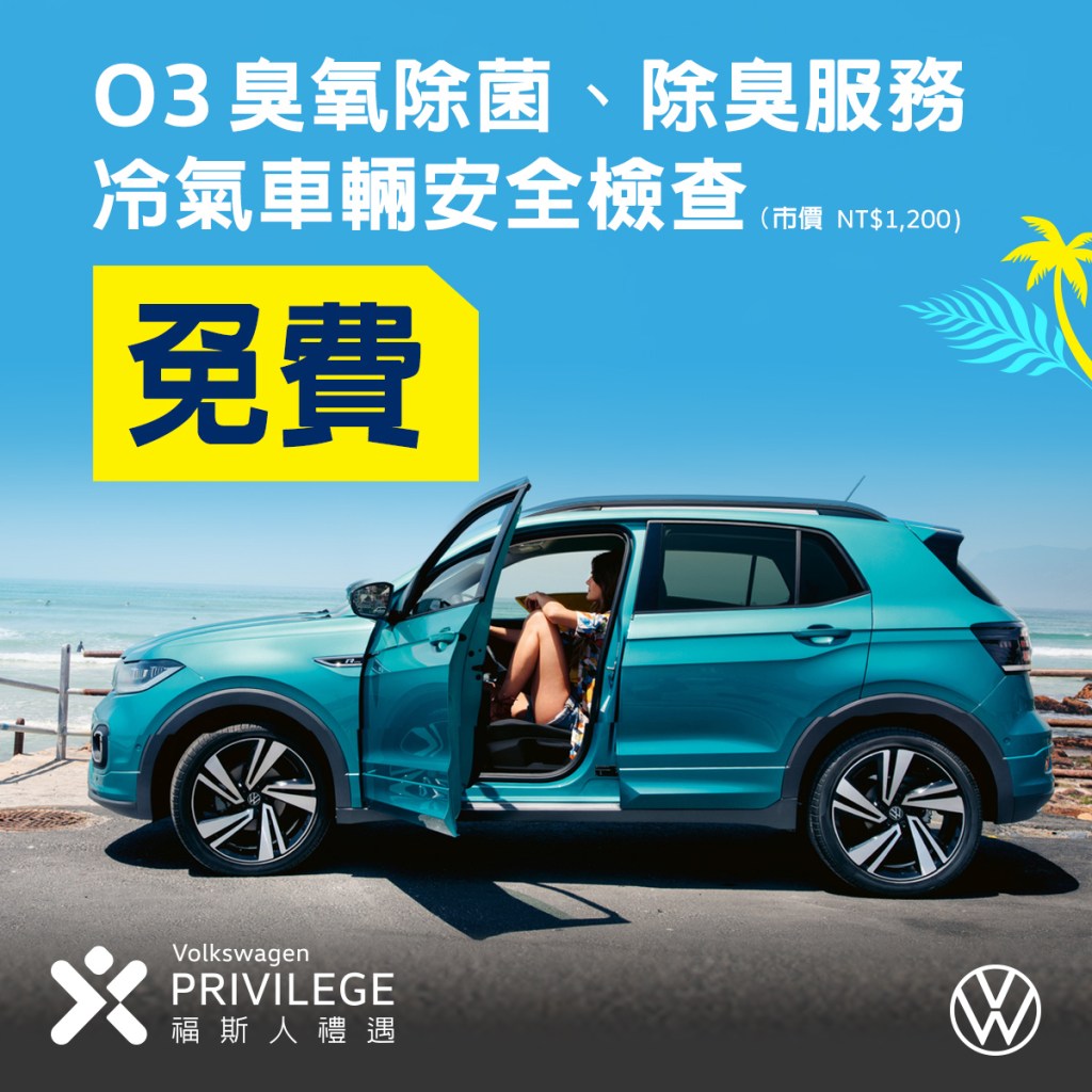 - Volkswagen夏季健檢服務免費23項冷氣車輛安全檢查和O₃臭氧除菌、除臭服務,「福斯人禮遇計畫」會員享指定原廠零件8折,敬邀車主預約回廠保養。