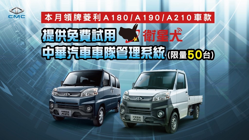 本月購A180/A190/A210享超優惠選購升級價ADAS智能安全輔助系統(市值20,000元),再享免費試用衛星犬/中華汽車車隊管理系統(限量50台)。車隊管理系統可透過APP或網頁查看車輛狀態、行駛、怠速、超速、失聯、即時位置、行車軌跡…等。其它外促活動請洽全台中華三菱,或至官網查詢https://www.mitsubishi-motors.com.tw/。