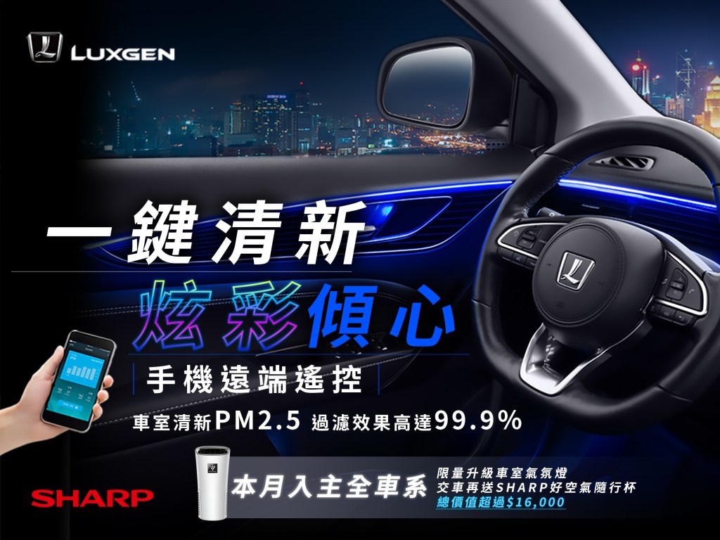 疫情期間自駕最安心,自主品牌LUXGEN防疫再升級,持續推動深受車主好評的健康對策,6/1(三)起至6/30(四)止,入主LUXGEN全車系可享「一鍵清新、炫彩傾心專案」(1):購車即享「60萬36期分期零利率」(2),全車系同步免費升級「PM2.5健康對策濾網」(3)、「終身免費返廠實施臭氧殺菌服務」等,提供全家大小健康且舒適安心的用車體驗。本月再攜手SHARP的日本超人氣商品「好空氣隨行杯(4)-隨身型空氣淨化器」,透過夏普獨家高濃度自動除菌離子技術、20度角設計與康達氣流,提高車內空氣循環淨化及除臭速度,有效抑制新冠病毒變異株(5)、擾人異味和細菌病毒,讓您的車室化身最安全的移動空間,隨時都享有安心、清新的好空氣,輕輕鬆鬆防護再升級!同時,乘坐體驗也升級時尚的「環艙炫彩氣氛燈組」(6)(價值12,000元),可透過手機APP控制燈色,內建多種智慧模式搭配高度客製化的漸層調色介面,大幅提升科技氛圍,依照您的心情客製專屬個性座艙,透過光影的變化組合,為每一趟旅程帶來最炫彩的樂趣體驗,一上車就傾心!