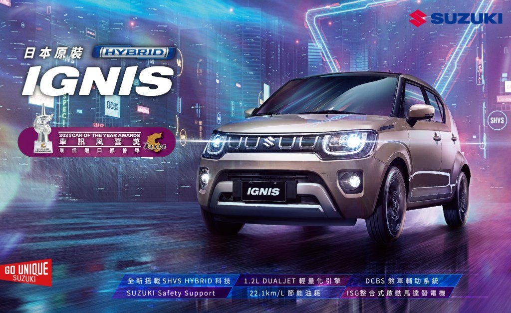 IGNIS以經典時尚的設計理念,將掀背功能與SUV車型完美結合,車室空間以水平線延伸出遼闊舒適的視覺感受,後座採6/4分離式設計,隨心變化出最大501L的收納空間。透過SUZUKI Safety Support及DCBS煞車輔助系統等安全科技配備打造出極智行車守護。動力方面,IGNIS全新搭載SHVS HYBRID輕油電科技與全新1.2L DUALJET引擎,創造平均油耗22.1km/L的一級能源效率,此外,1,197cc最小級距排氣量,造就IGNIS稅金與燃油的雙效節能表現。