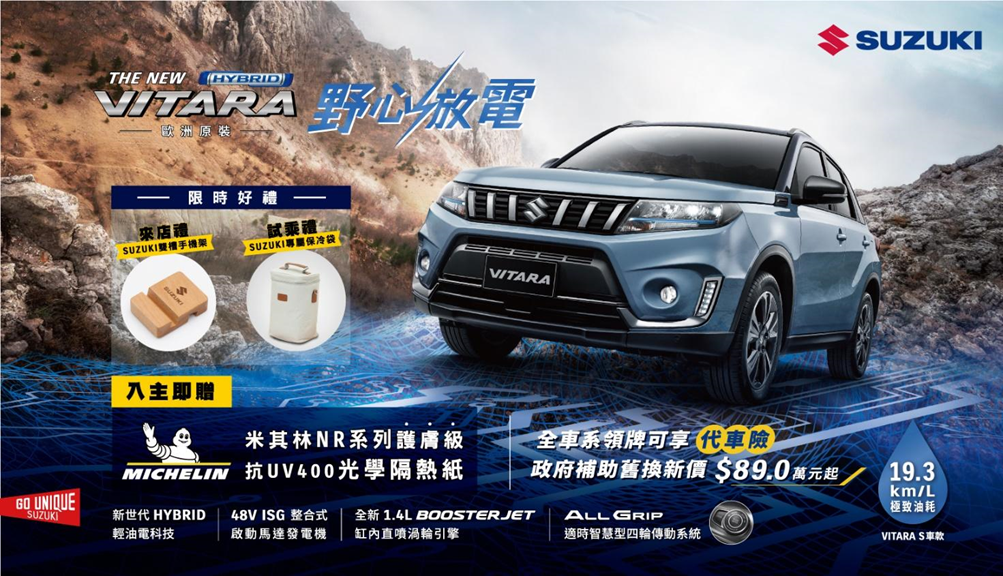 本月入主VITARA,享政府汰舊換新優惠價89萬起,領牌再享代車險及 MICHELIN米其林NR系列護膚級抗UV400多層光學隔熱紙,歡迎前往SUZUKI全台經銷商展示中心賞車試乘,親身感受VITARA電勁全場的野性魅力。