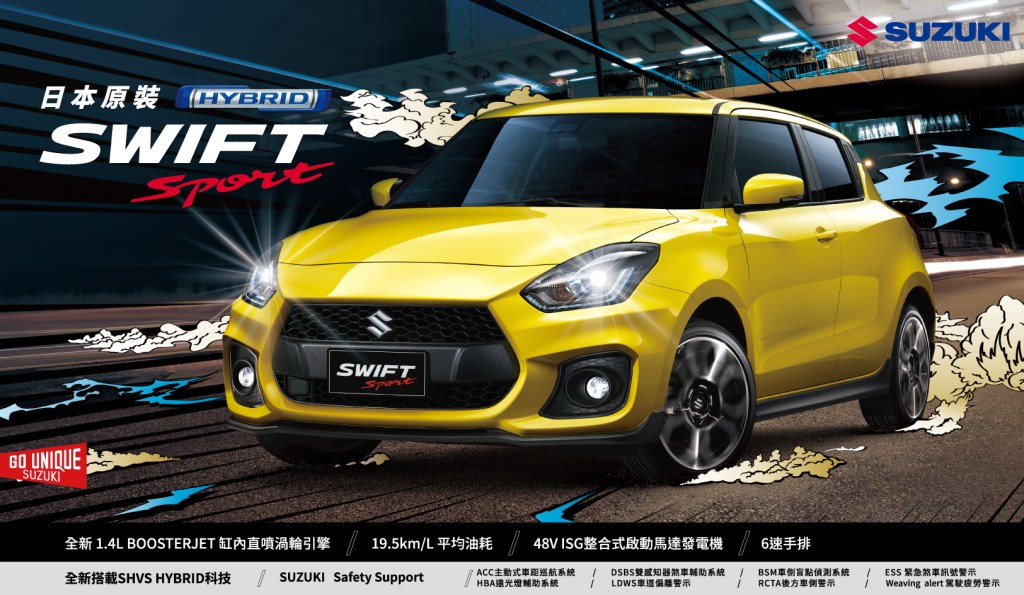SWIFT Sport可謂SUZUKI車系中的性能小超跑,以更性能化的設計彰顯其強悍本事。搭載HYBRID 輕油電科技,結合48V ISG整合式啟動發電機與鋰離子電池的SHVS智能混合動力車,搭配1.4 L BOOSTERJET缸內直噴渦輪增壓引擎,造就最大馬力129.2ps與最大扭力23.9kgm的狂猛動能。結合首度導入的6速手排配置,加上SUZUKI Safety Support全面的主動安全守護,讓您在車道能更無慮地釋放速度與激情。