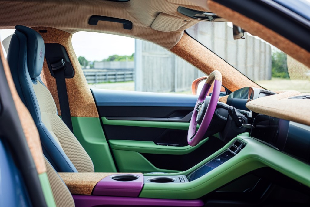 保時捷首次公開了這輛藝術車的內裝:鮮豔的色塊同樣延續 Nash Blue、Sean Peach、Loretta Purple 和 Ashley Green 等色彩,與儀錶板、方向盤和中控台上的軟木材質形成視覺對比。燈芯絨材質則為其增添另一種獨特風情。車內頂篷、中央椅面和遮陽板均採用荒漠米色(Atacama Beige)的燈芯絨裝飾。身為一位忠誠的純素食主義者,Wotherspoon不僅於內裝採用無皮革材質,同時也希望提供其他 Taycan 車主無皮革內裝的選擇。