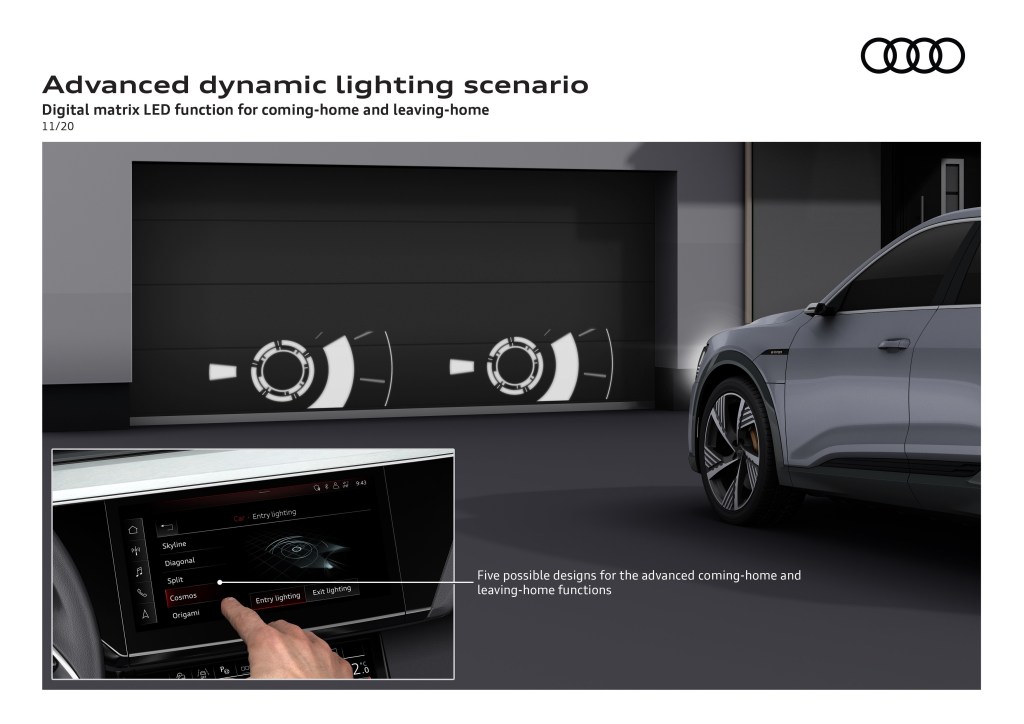 四環品牌近期發佈的Audi A6 e-tron 概念車透過Audi數位矩陣式LED 頭燈,展現燈光將為人們帶來嶄新的娛樂體驗。未來Digital Matrix LED 頭燈能夠將影像投射至前方地面或牆面上,使其與人互動進行遊戲,讓車輛充電的同時也能享受有趣且悠閒的時光。