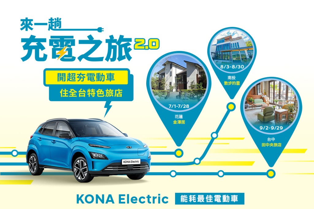 充電之旅第二季主要瞄準近期最夯的東部及中部,有位於好山好水的花蓮「金澤居」(7/1~7/28)、渡假勝地日月潭的「散步的雲」(8/3~8/30)以及座落於台中市中心的「田中央」(9/2~9/29),消費者於活動期間入住HYUNDAI充電之旅專案,即免費享有KONA Electric擔任二天一夜旅程的交通伴遊,讓充飽電的 KONA Electric 帶您展開充電之旅 。