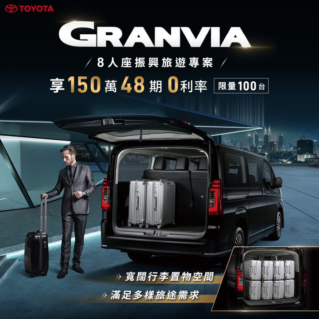 因應疫情管制逐漸鬆綁,和泰汽車特別推出GRANVIA 8人座旅遊振興專案,即日起至七月底提供TOYOTA GRANVIA 8人座豪華版限量100台,150萬48期0利率購車優惠,讓消費者享有低頭款,就能輕鬆入主GRANVIA 8人座多功能豪華商旅座駕。TOYOTA GRANVIA 8人座豪華車室及寬闊行李置物空間,可以同時滿足商務、旅遊需求,深受飯店/機場接送、包車旅遊及多代同堂家庭的消費者喜愛。