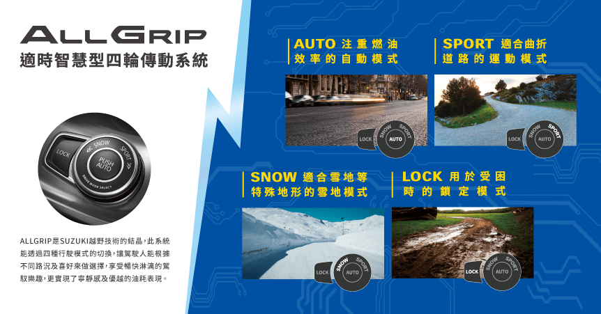 VITARA科技性能全面勁化,搭載新世代 48V HYBRID 輕油電科技及 1.4 L BOOSTERJET 缸內直噴渦輪增壓引擎,可輸出 129.2 PS / 23.9 kgm 的強悍動力,更以優異車身結構及輕量化設計,實現寧靜感及優越的油耗表現,S 車款更造就 19.3 km/L* 節能油耗。不只動能勁化,VITARA讓你玩更野! ALLGRIP 適時智慧型四輪傳動系統可依路況及喜好,在 AUTO / SPORT / SNOW / LOCK 四種行駛模式中自由變換,一路更有ACC主動式安全車距巡航控制、BSM 車側盲點偵測、DSBS 雙感知器煞車輔助等SUZUKI Safety Support 安全科技為你隨行守護,從主動到被動,提供駕乘者完善保護。VITARA獨樹一格的外型搭配傲人的越野性能及持續進化的安全科技,激發你對駕馭的渴望!