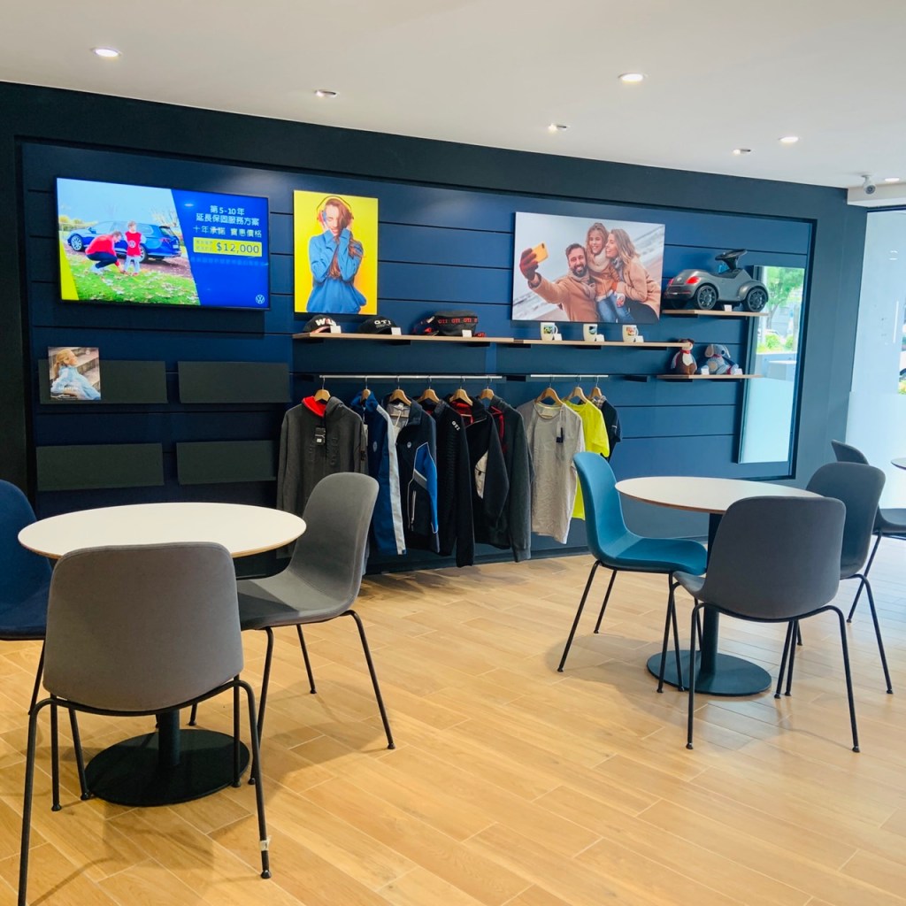 Volkswagen 民族服務中心以玻璃帷幕引進室外自然光,搭配自信飽和的色彩運用,打造親切開放的空間氛圍。其中,室內設有溫潤質感的原木高吧桌,精心準備的風味小點,提供車主回廠保養愛車之餘擁有愜意的休憩氛圍,感受Volkswagen自信活力的品牌風格。而維修服務中心設置電子看板顯示車輛保養進度,同時設有10區工位,讓Volkswagen車主享受專屬的回廠保修空間,再搭配專業的技師團隊與數位化的整合科技,可完全掌握即時的愛車資訊。
