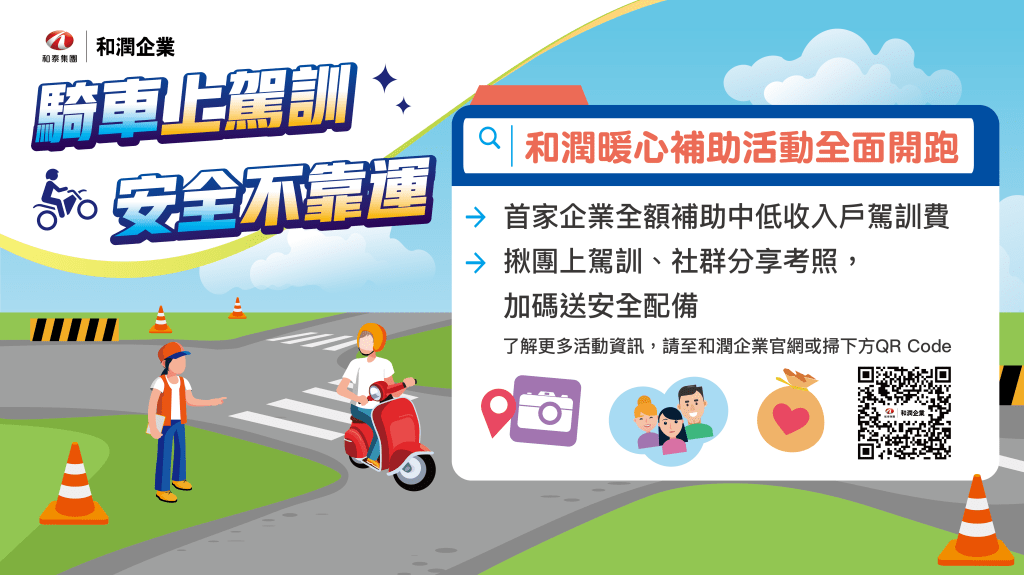 和潤企業也與台北市區監理所一起合作透過行銷廣宣手法,鼓勵人們到駕訓班學習騎乘機車,例如:揪團3人成行報名駕訓班就送每人乙頂安全帽、考取機車駕照月月抽獎送行車紀錄器,透過300多組安全配備的贈送,一來增加考照附加價值,鼓勵大家加入機車駕訓班行列,二來也是希望考取駕照上路能有完善的安全配備。騎乘知識、配備雙管齊下,安全雙重保障。相關補助申請、安全配備贈送,自即日起開跑,活動詳情請上和潤企業官網(https://reurl.cc/A7Vj9K)、台北市區監理所官網(https://reurl.cc/NAvQNQ)查詢。