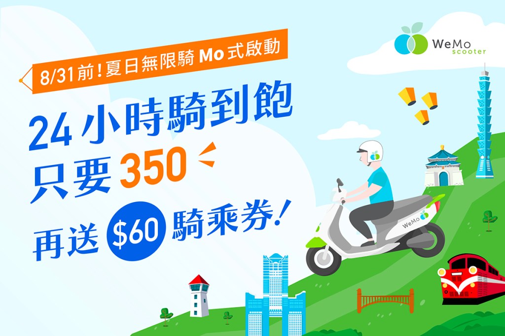 WeMo Scooter 即日起至 8/31(三) 止,感謝百萬用戶與廣大網友的熱烈支持。敬請下載登入WeMo Scooter APP後,點選購買小時租方案,即可搶購不到1折的「 夏日無限Mo式啟動」專案優惠方案,馬上享有最舒適方便的騎乘體驗。最後,再次呼籲大家請即早把握機會搶購,避免向隅。