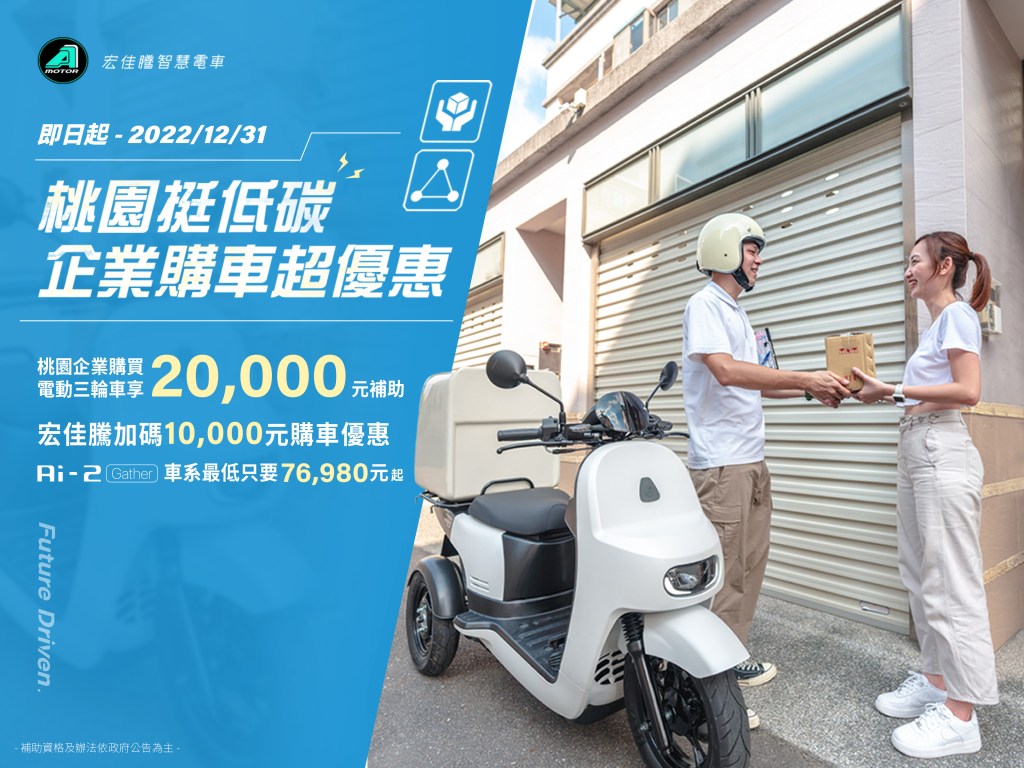 隨著三輪商務智慧電車Ai-2 Gather受到企業陸續採用,宏佳騰不僅率先以高度客製化、全方位車款優勢協助企業採用綠色交通運具,也祭出每輛10,000元購車優惠,搭配桃園「企業智慧用電綠色交通運具補助計畫」,企業還可享有不限購置數量、每輛補助20,000元政策,再搭配工業局法人補助7,000元;環保局法人補助4,000元等眾多折扣,讓企業最低只需76,980元就可輕鬆添購公務執行時的最佳幫手,極具競爭力的優惠價格,絕對是企業的購置首選。此外,針對欲選購宏佳騰雙輪智慧電車的企業,最高亦可享有每輛6,000元專屬補助;讓有意購置宏佳騰智慧電車的企業能以更超值的預算,與宏佳騰智慧電車一同邁向減碳環保的綠能運輸行列。相關優惠資訊歡迎洽詢鄰近智慧電車門市。