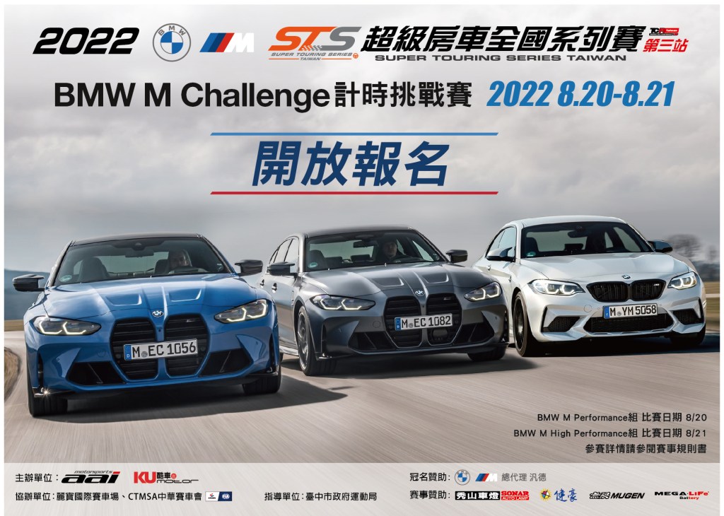 主辦單位指出,今年6月底的第二站比賽,除了Super Car各組別賽事外,呼應眾多車友們的期待,特別增加了TOYOTA GR YARIS與FORD FOCUS組計時賽的賽程,讓一般房車的車主們都能更親近這類大型比賽。接下來的8月賽事,STS超級房車全國系列賽將與本次冠名贊助商BMW台灣總代理 汎德股份有限公司合作,推出BMW M Challenge計時挑戰賽。本次的BMW M Challenge計時挑戰賽分為BMW M High Performance與BMW M Performance兩個組別,8月20日(週六)為M Performance組賽事,限M135i、M140i、M235i、M240i、M340i、M440i、M550i、M850i等車款參加(不限車型年份);8月21日(週日)則是M High Performance組,限 M2、M3、M4、M5、M6等車款參加(不限車型年份)。比賽採計時賽形式,分別以兩回合最佳單圈成績加總後進行本次計時賽的最後排名,每組最多僅同時開放25輛車下場比賽。