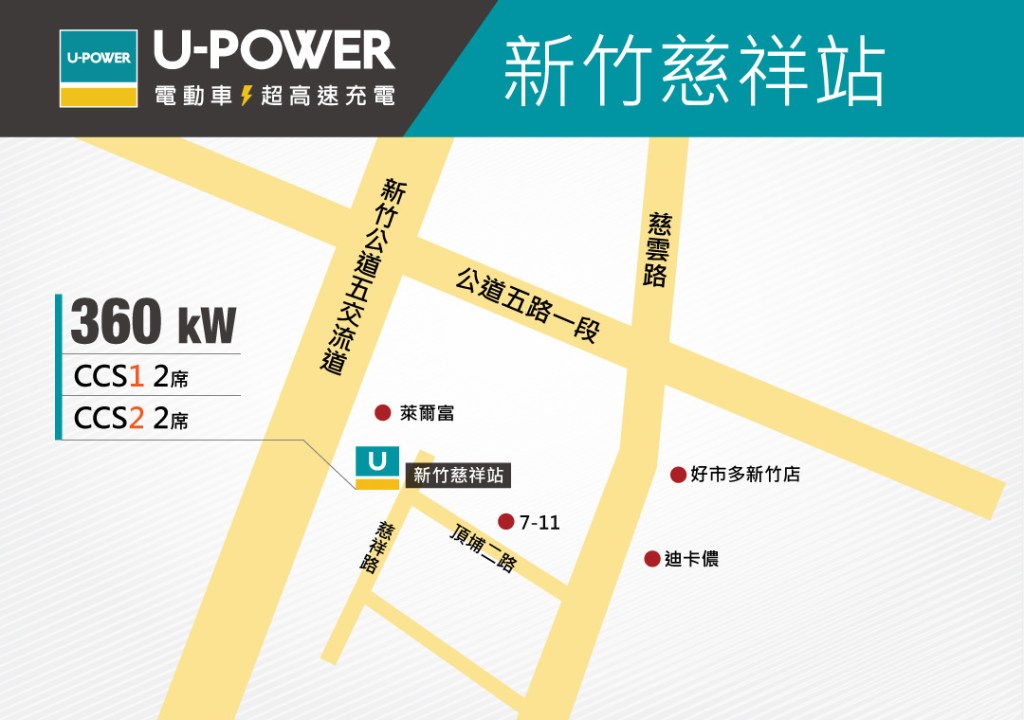全新上線的新竹慈祥站,位於新竹市東區慈祥路,距離中山高速公路公道五路交流道3分鐘車程,鄰近新竹科學園區及慈雲路夜市,附近有多家便利商店及好市多、迪卡儂等賣場,對於大新竹都會區的使用者十分便利。臺南裕農站位於臺南市東區裕農路,臨近大灣交流道,國道1號南下大灣交流道僅需3分鐘車程,北上用路人從仁德交流道亦僅需3分鐘,交通十分便利。周邊有星巴克、路易莎咖啡、麥當勞,可服務臺南、永康、南科生活圈的電動車車主。新竹慈祥站及台南裕農站對於南來北往的用路人均十分方便。
