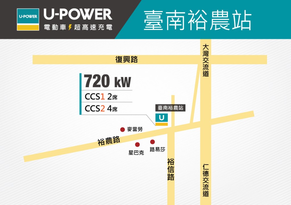 致力於以提供消費者最佳充電體驗為營運宗旨的U-POWER旭電馳科研,今日宣布新竹慈祥站、臺南裕農站將於7月25日展開試營運,以五站展現U-POWER全臺超高速充電網路雛形。臺南裕農站更建置業界功率最高720kW註1充電設備,並配置3支可支援超高速充電體驗液冷槍 (500A),搭配U-POWER營運團隊細膩的軟硬體設計更新與優化,提供電動車車主最佳充電體驗。