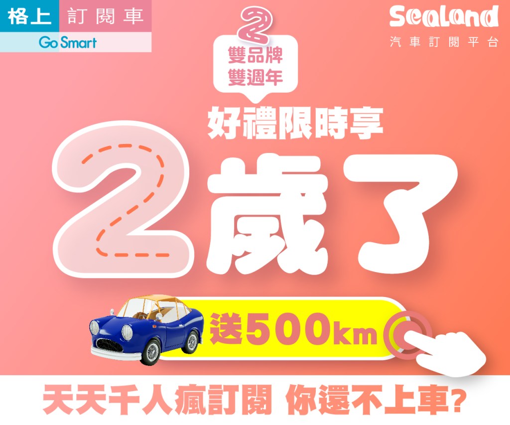 格上訂閱車與策盟Sealand汽車訂閱平台深耕訂閱車市場2年,創下市佔第一佳績!歡慶雙週年,首創推出「雙平台、雙優惠」的聯合促銷,訂車就享免費500公里里程的優惠,週年慶期間加入格上訂閱車LINE官方帳號好友還能再抽1000公里免費里程,在悠遊國旅期間,讓消費者暢行全台景點,玩到盡興。