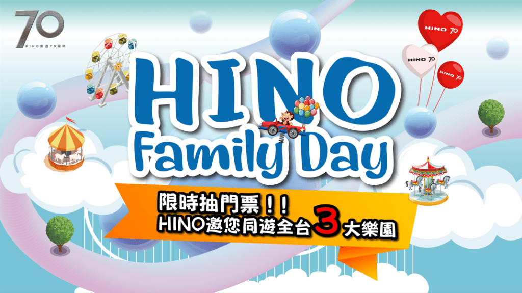 和泰汽車代理的HINO商用車,自1952年來台銷售,今年適逢70周年,為感謝廣大車主長期以來的愛護與肯定,特別舉辦HINO Family Day活動,邀請平時忙於工作的車主,能與家人親友到三大遊樂園一起開心暢遊,共享歡樂時光!