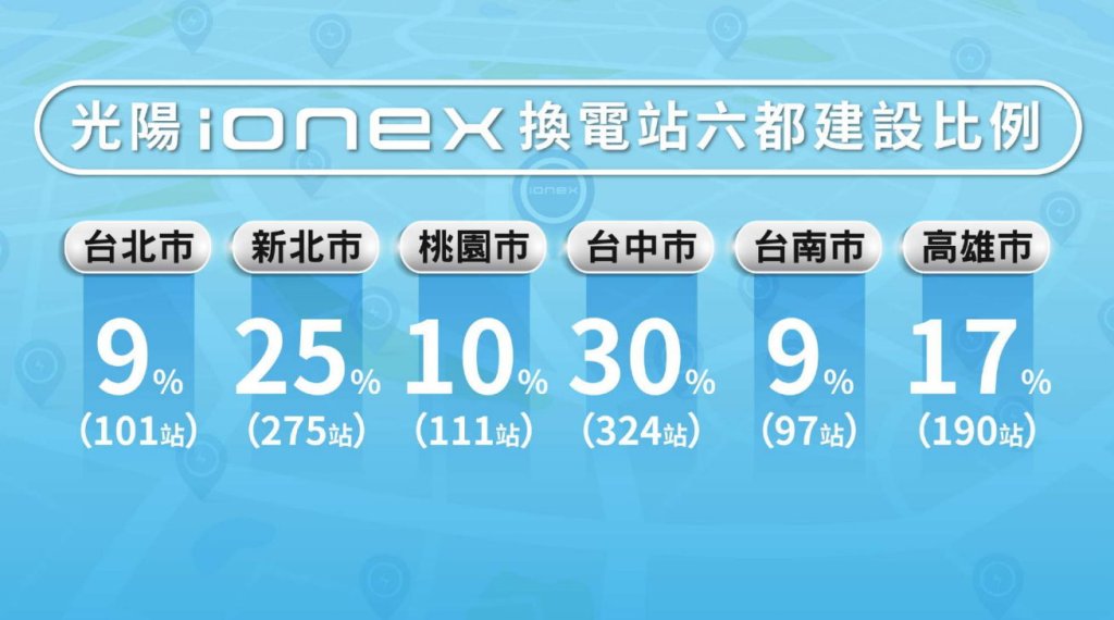受到疫情與晶片短缺等多重因素的影響,Ionex建站速度在上半年有所減緩,不過下半場開始KYMCO加快腳步,今年2,000站的建站目標可順利達成,甚至還有機會超過。截至目前為止,Ionex 3.0已在全台各地佈建了1,533個換電站,其中1,098站的71.6%分佈在六都,依照比例來看台中市約佔30%(324站)、新北市25%(275站)、高雄市17%(190站)、桃園市10%(111站)、台南市9%(97站)、台北市9%(101站);而六都以外的縣市則佈建了435站,包括在西部地區的354站、東部地區79站及離島2站。
