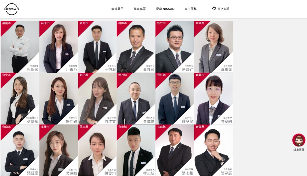 2022年首次精選出150位績優業務同仁榮登NISSAN官網的數位銷售顧問平台,消費者可依所在區域選擇最近展示中心的數位銷售顧問,查看其自我介紹及銷售簡歷等資料,快速找到最適合的數位銷售顧問,體驗貼心專業的線上諮詢,不用出門也可輕鬆瞭解完整購車資訊。