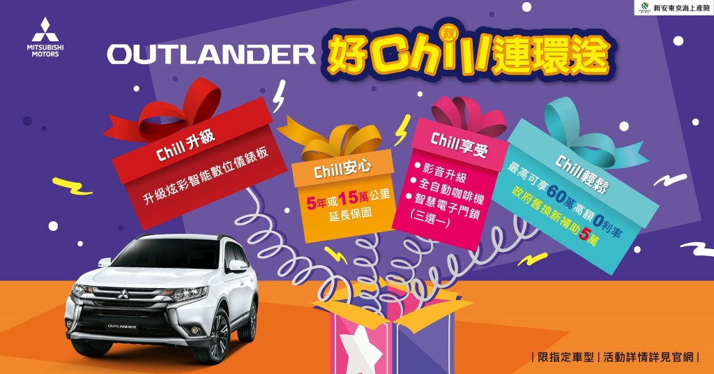 | OUTLANDER ‘22年式 2WD 91.5萬~113.5萬 4WD 110.5萬 | OUTLANDER禮上加禮!凡活動期間購買OUTLANDER尊貴型、尊貴型7人座、S-AWC旗艦型任一車種並完成領牌,即享豐富多重好禮!第一禮:指定車型免費升級炫彩智能數位儀錶。第二禮:安心保固送給你!加贈5年或15萬公里延長保固。第三禮:Panasonic9吋觸控多媒體主機免費升級(市價65,000元)/「義大利迪朗奇 De’Longhi 全自動義式咖啡機」( 市價 34,900元 )/「PHILIPS 飛利浦智能門鎖」( 市價 22,000 元) 好禮三選一。第四禮:60萬高額0利率。第五禮:政府舊換新補5萬馬上領。OUTLANDER好好價給你!活動期間只要82.9萬起(含政府舊換新補助)! |