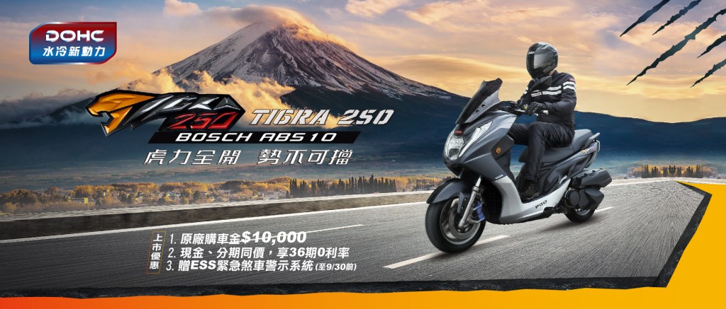 PGO 黃牌小鋼炮 TIGRA 250 熱銷爆棚訂單突破500張!原廠再宣布 ESS 緊急煞車警示系統加碼搭贈至九月底。自 7/13(三)發表黃牌入門首選 TIGRA 250 後,引發討論熱潮,迄今訂單量已突破500張,原限定上市預購搭贈的 ESS 緊急煞車警示系統將加碼展延,凡於九月底前訂購 TIGRA 250 的準車友都可以完美搭贈,除此之外,直扣10000元購車金、現金購車及分期36期0利率同價優惠也將持續進行至九月底,錯過不再。