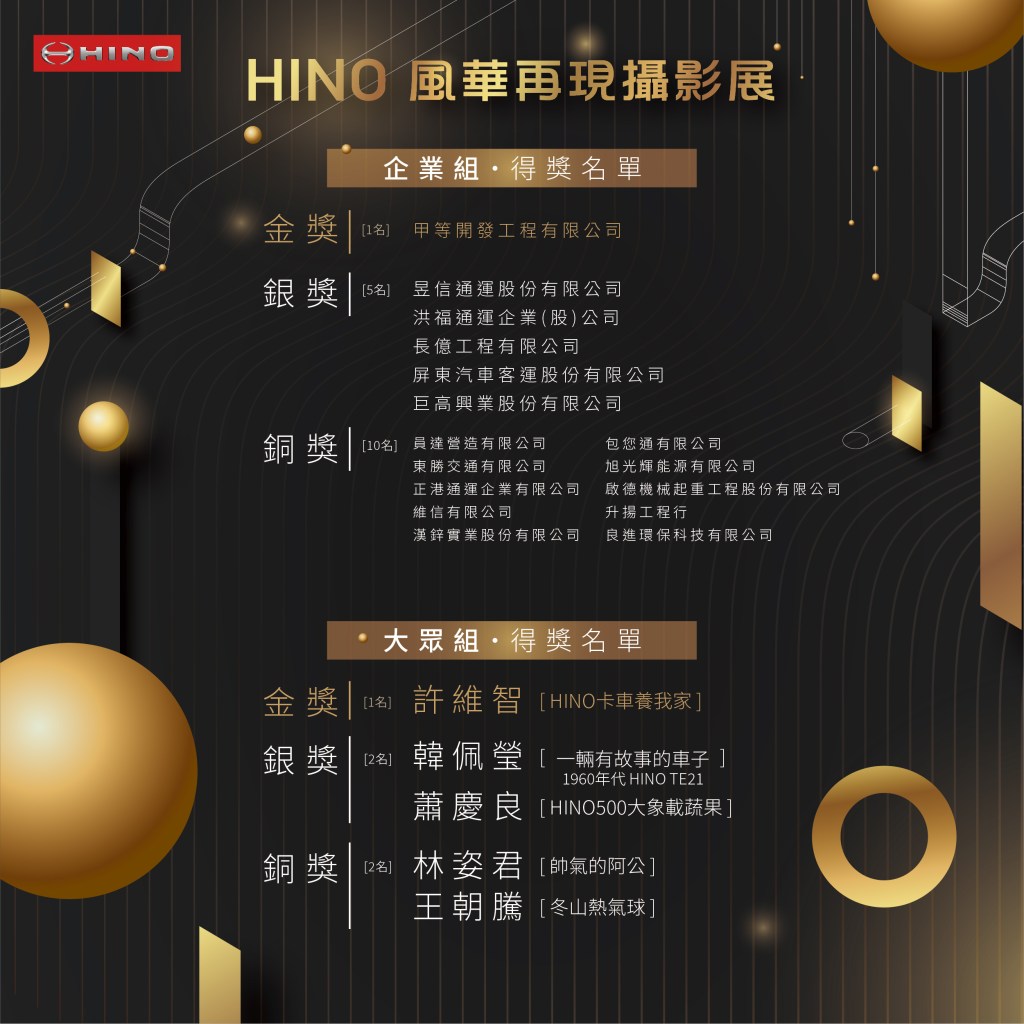 企業組金獎由甲等開發工程有限公司獲得,將HINO形容為最貼心的終身伴侶,守護主人20年的志業;大眾組金獎由許維智獲得,主題為HINO卡車養我家,1972年一輛12噸的砂石卡車不僅是父親的謀生工具,也是全家出遊的休旅車。