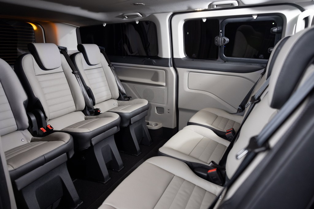 九人座Kombi車型車身尺碼為長5,339mm、寬2,030mm、高2,024mm、軸距3,300mm,透過霸氣且充滿設計感的3 Bar盾型黑色水箱護罩和造型銳利的光感應啟閉頭燈,帶來頗具視覺辨識度的歐系視覺氛圍,同時採用單邊右側滑門與專屬腳踏板設計,讓乘客享有兼具安全與便利的上下車體驗。受惠於果嶺式平整化底盤配置,九人座Kombi車型不僅擁有寬敞的車室空間,同時內建前傾、翻摺、拆卸等變化功能的座椅設計,塑造出靈活多元的空間機能。同時,九人座Kombi車型同步對應多項實用設計,包含:皮質包覆、且有四項調整配置的三幅式多功能方向盤、內建SYNC®3娛樂通訊整合系統的4.5吋多媒體螢幕(含藍牙及USB功能)、6具揚聲器喇叭、內含12V插座與USB插槽的駕駛座前方置物空間、中控台上方開放式置物空間和後行李廂防刮保護板等豐富配備。