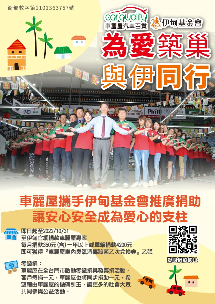 用我們的專業,讓安心安全成為愛心的支柱,支持公益不間斷,車麗屋汽車百貨與伊甸社會福利基金會共同呼籲,期盼您您踴躍投入,也希望您在參與公益活動時,也能感受到車麗屋全體同仁的愛心與關心,再次邀請您參與「為愛築巢 與伊同行」活動,也歡迎您至全台車麗屋門市消費外,也能響應零錢捐、發票捐活動,讓我們集結眾人的力量,成為公益團體邁向未來的動力。活動詳情請洽伊甸社會福利基金會(02)2230-7715分機5318。