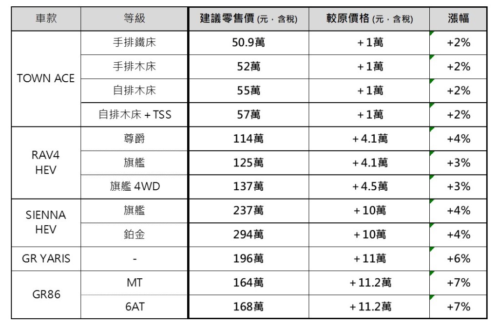 和泰汽車表示今年以來車用原物料成本仍持續上漲,加上全球供應鏈受疫情衝擊造成車用零件短缺,各項造車成本不斷攀升,日本原廠已無法完全吸收,故自2022/9/20(含)起調整下列車款價格,調漲幅度2~7%,調整後建議售價: