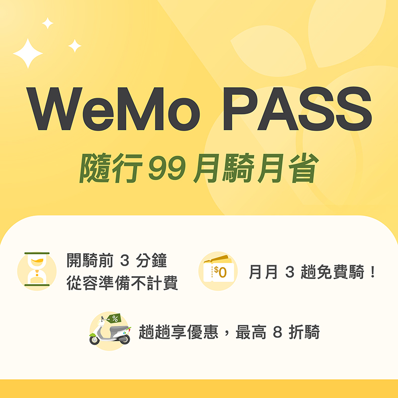 # 註 : 凡加入「WeMo PASS」後,不僅每月前3趟騎乘20分鐘免費外,完成了5趟以上(包含)即享現折 95 折、10趟以上(包含)即享現折 9 折、15趟以上(包含)即享現折 85 折、20趟以上(包含)即享現折 8 折優惠。