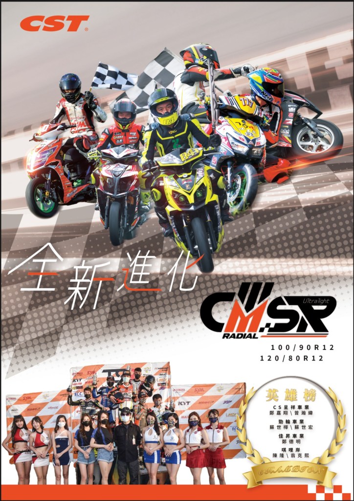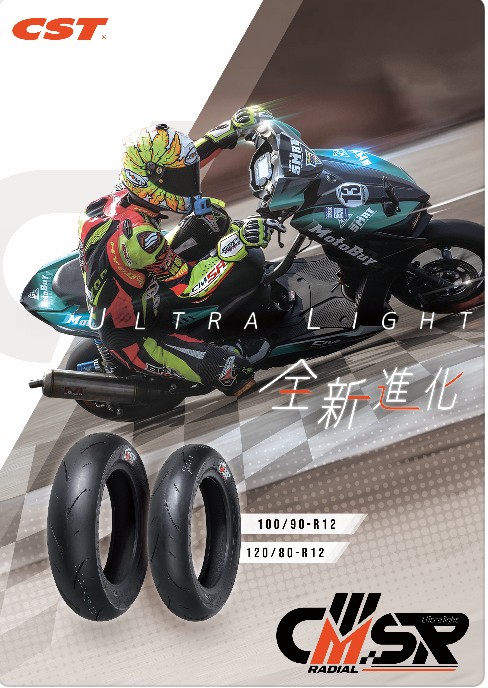 2017年發表第一代的CMSR十二吋競技胎,經過多年醞釀推出全新一代的CMSRR,規格為100/90R12、120/80R12。單一輪胎胎體輕量化達500公克,新舊款胎款的重量差異達13%,試圖在極度輕量化與操控性方面取得平衡點,帶給騎士全新的操駕體驗。這次所謂的子午結構是指胎體與行駛方向呈90°或接近90 °