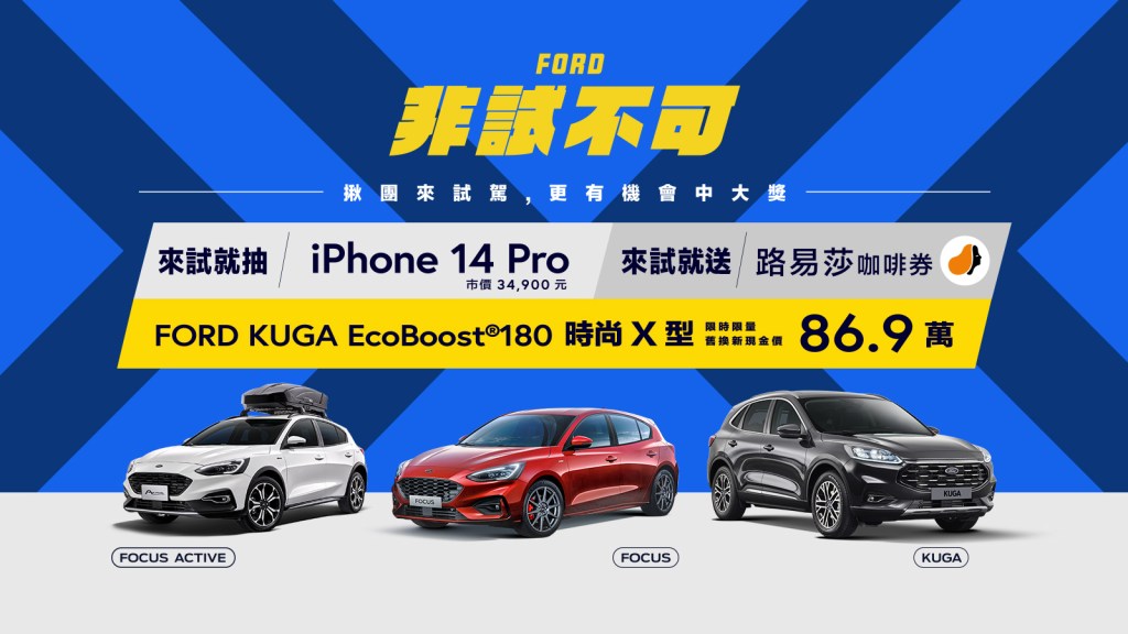 | Ford全車系 | 10月1日至10月31日止 前往全台經銷據點體驗試駕任一車款,即可獲贈路易莎咖啡兌換卷乙張(數量有限,送完為止),並具備週週抽iPhone 14 Pro的抽獎資格,揪團試駕中獎機率再加乘 |