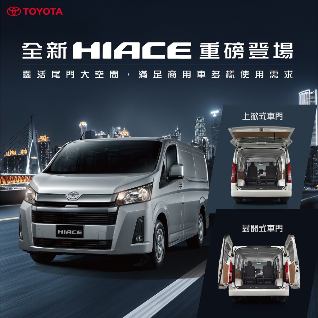 除熱銷的上掀式尾門車型外,今年10月特別引進對開式尾門車型,讓HIACE車型選擇更完備,不論是物流載貨或精緻運送,全新HIACE將是您打拼事業的好夥伴。即日起於和泰汽車商用車經銷商/長源汽車、蘭揚汽車、東部汽車營業據點正式銷售。購車請洽全台營業據點,亦可至TOYOTA商旅車官網(www.toyota-granvia.com.tw)查詢,或致電和泰汽車顧客專線0800-522567洽詢。