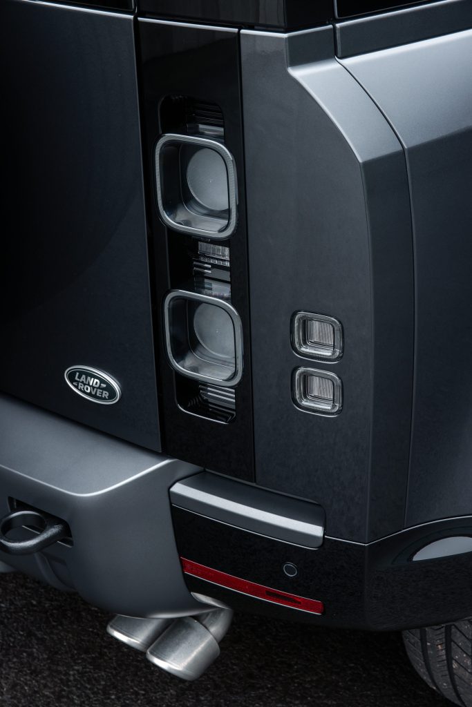Land Rover Defender 110 V8 Carpathian Edition 車色採用深色頂級喀爾巴阡灰金屬漆與緞光防護膜相互搭配,引擎蓋、尾門和車頂則採用亮澤黑與車身形塑對比;配置 22 吋亮黑色鋁合金輪圈與黑色卡鉗,極大化吸引路人目光焦點,全車透過一系列專屬外觀套件,塑造尊爵不凡的王者氣勢。車尾排氣管採用極具性能表率的雙側四出設定,車門兩側下飾板鑲嵌 V8 金屬銘版,為 Land Rover Defender 110 V8 Carpathian Edition 整體車身設計寫下最佳註解。