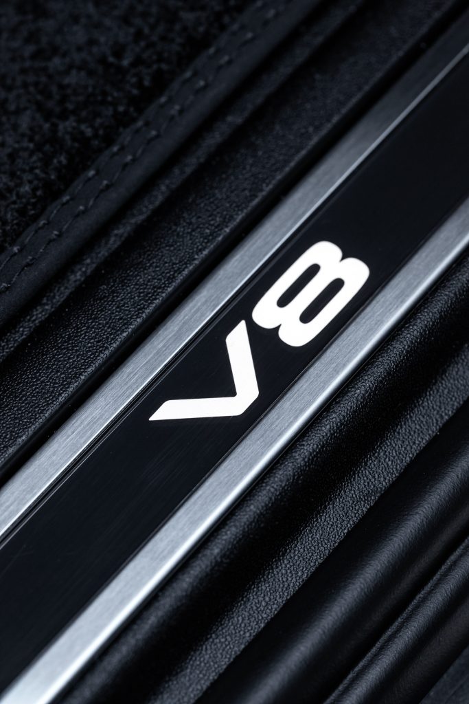 進入車室,發光金屬門檻上鑲嵌著 V8 專屬字樣映入眼簾,彰顯其不凡的身分定位,全車座椅採檀木黑溫莎皮革,四幅式多功能方向盤採用麂皮包覆並搭配鍍鉻換檔撥片,形質俱佳的麂皮為車室奢華內裝增添性能氣息。排檔桿以及中央飾蓋則採皮革包覆營造更好的操作手感,結合貫穿中控儀錶的專屬緞光黑色裝飾與檀木黑車頂內篷,車室內嶄新設計語彙透過頂級材質運用,共同交織旗艦性能車型獨有的頂級奢華感受。