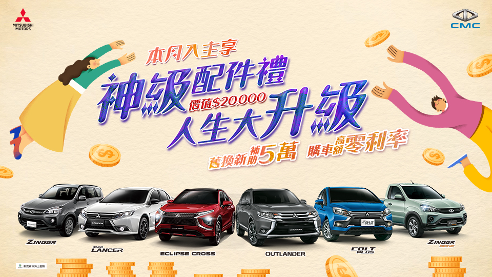 | 乘用車「兩萬神級配件禮」外促交車禮 | 三菱神級配件禮,人生大升級!凡於本月訂車及完成領牌指定車款COLT PLUS 、LANCER、OUTLANDER、ZINGER、ZINGER PICK UP、ECLIPSE CROSS 任一車種,馬上享有市價最高2萬元以上精選升級配件。各車型精選多項超值配件讓你挑!不管你要智能升級、安全升級還是娛樂升級!只要你想要,中華三菱通通有! |