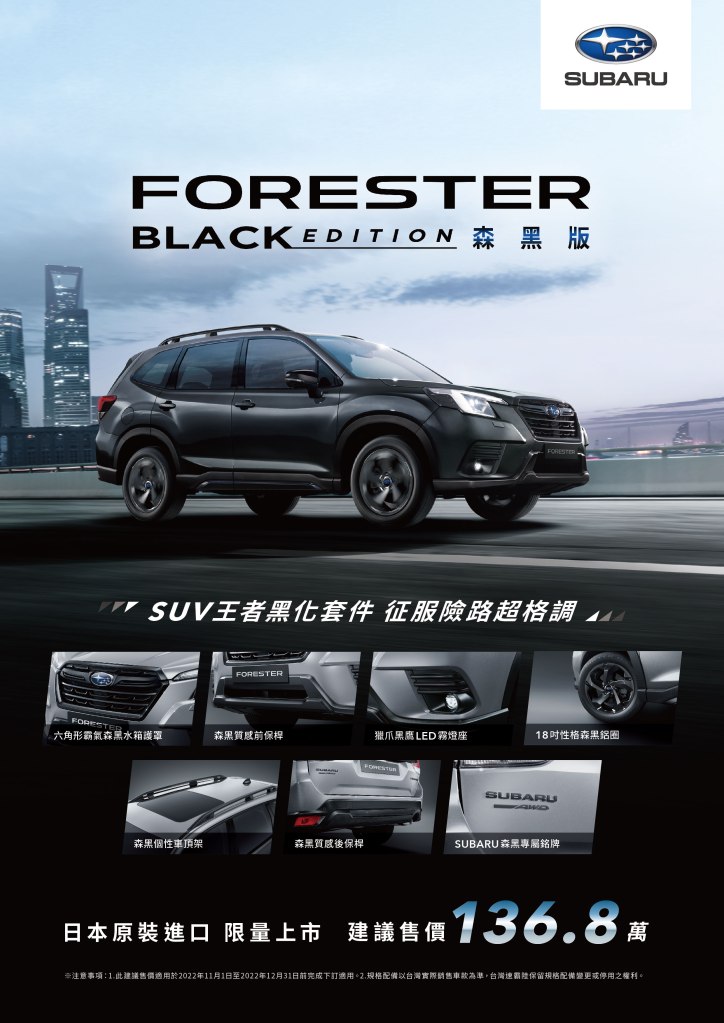 台灣意美汽車敬邀全台消費者親臨SUBARU全台展示中心一睹Forester森黑版獨特魅力,並於11月12日至11月13日舉辦Forester Black Edition賞車會活動,欲了解相關資訊,請洽詢各展示中心據點:https://www.subaru.asia/forester-black-edition/?reg=tw&lang=zh