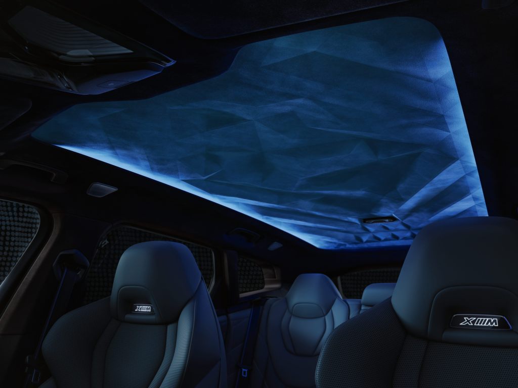 媲美頭等艙等級的M Lounge後座空間,寬闊同時加長深度的座椅使用BMW Individual Merino真皮包覆,柔軟富彈性的皮革一路延伸至車門,搭配BMW XM專屬的Alcantara麂皮靠枕,讓後座的乘客即使面對面倚靠車門對談依然輕鬆舒適。首次搭載於BMW車系的Alcantara光稜頂篷,可隨著環艙氣氛燈為車內座艙提供間接照明,為每一趟旅程增添絢麗而奢華的神秘感受。