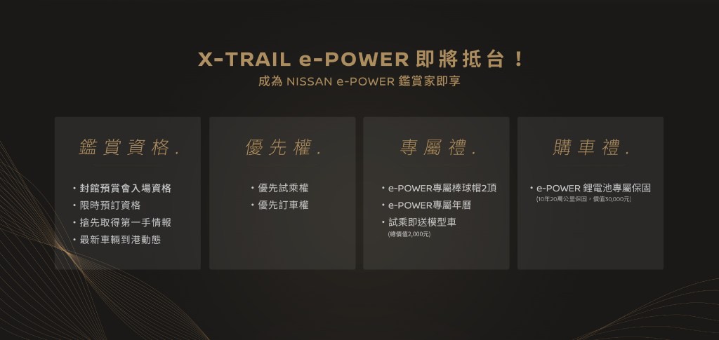 - 優先訂車權:會員優先預訂X-TRAIL e-POWER。