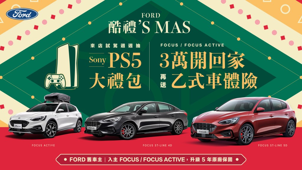 在分享喜悅的聖誕節檔期,福特加碼祭出限時優惠,於活動期間2022年12月1日至12月31日,消費者至Ford全台經銷據點試駕任一車款並上傳至社群媒體(FB/IG)分享,即具備SONY PS5大禮包抽獎資格。此外,成功邀請2位以上新朋友完成試駕,主揪再享額外抽獎機會。近年持續熱銷的New Ford Focus及Focus Active,同步於12月推出「限時3萬開回家」的限時限量優惠;首付3萬元,即能以首年月付5,888元的購車方案入主優質新車。Ford舊車主升級New Ford Focus或Focus Active更享有5年原廠保固專屬優惠,享有Ford好車的同時,擁車也更輕鬆。