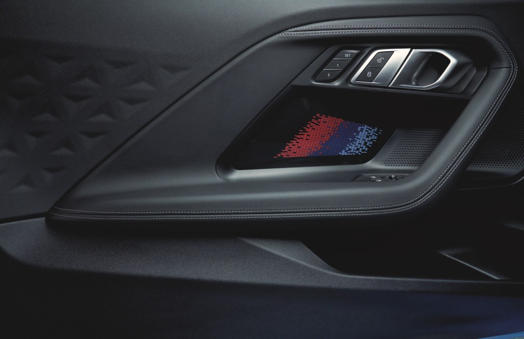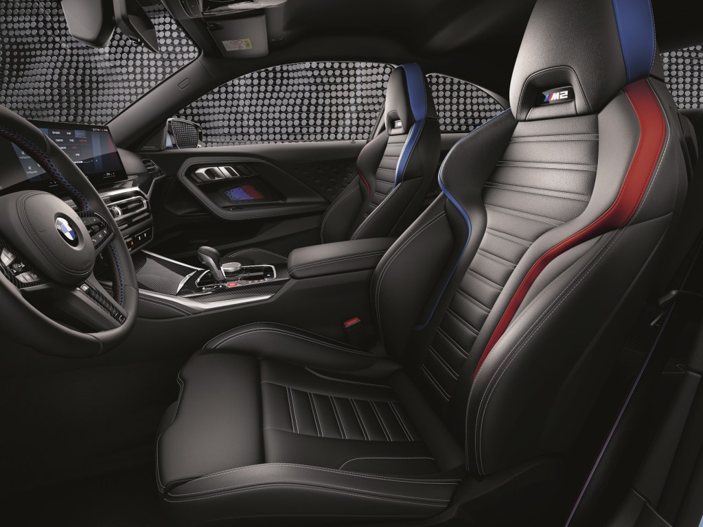 經典的駕駛導向設計搭配大量的M專屬風格,包含M專屬紅色引擎啟閉鈕、M功能真皮方向盤搭配專屬縫線、M縫線安全帶以及M車款專屬的M光影車門飾板等,為全新世代BMW M2打造出極具熱血氛圍的車室空間;首次出現在BMW車款中,以M品牌三色識別色彩包圍的Vernasca真皮M雙前座跑車座椅,以黑色皮革對襯鮮明的藍、紫、紅色彩,點綴發光的M2車型銘牌標誌,是此次全新世代BMW M2的內裝重點之一。