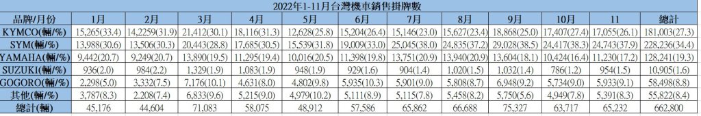 | 2022年11月台灣機車銷售掛牌數 | |||