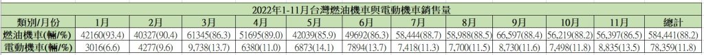 | 2022年11月台灣燃油機車與電動機車銷售暨佔有率 | ||