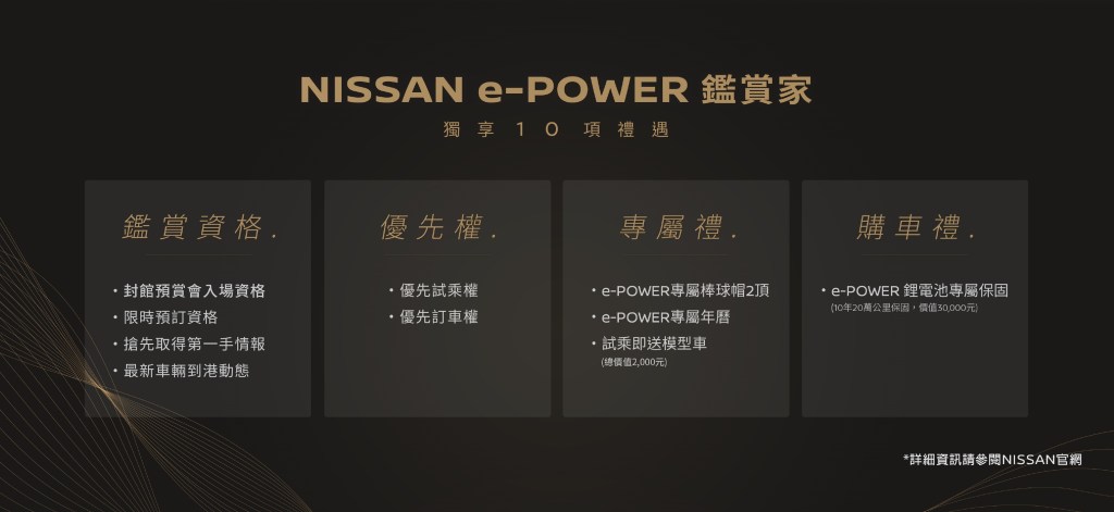 - 搶先取得第一手情報:將由NISSAN官方提前提供會員有關e-POWER第一手情報內容。
