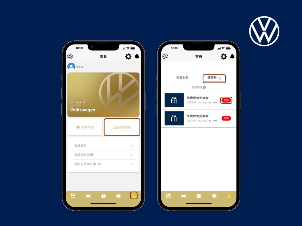 此外,若車主欲查看「優惠劵獎勵服務」功能,可於My Volkswagen® 進入「會員」頁面,點選「優惠獎勵」按鈕,便會出現「優惠券」票券夾,只要將可兌換之優惠券出示於服務中心,即可由服務中心人員輸入指定兌換碼完成兌換。除了全新功能擴增外,台灣福斯汽車致力精進品牌體驗與售後服務,以「福斯人禮遇計畫」各式優惠活動,結合My Volkswagen® 的多項功能,創建車主專屬社群平台,提供車友間資訊交流、獲得品牌新訊息、分享愛車生活,以零時差的數位化服務,一手建構自賞車、購車至擁車的完美顧客旅程。