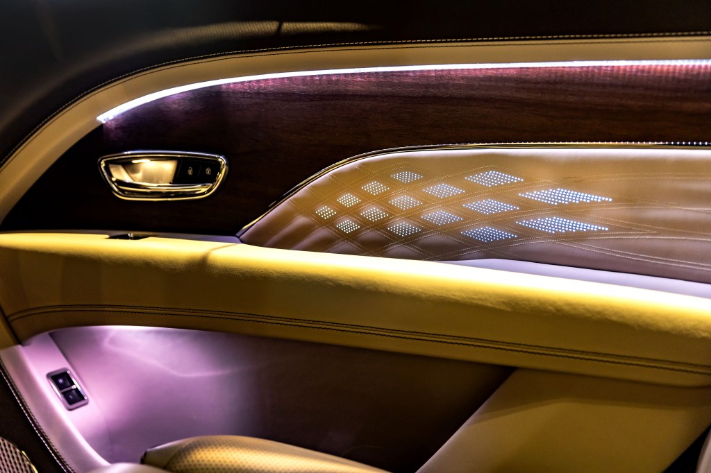 Bentayga EWB擁有最先進的車室絎縫圖紋,結合數位化的工藝技術,精緻對稱的鑽石型菱格紋在椅面肩部優雅呈現,頂級皮革格紋中更綴以直徑小於1 mm的細孔,跳脫以往的現代設計在車門面板與室內空間延續整體性。獨特的流光菱格套件將每片前門板12顆、後門板22顆LED光點崁入皮革孔紋中,精心排列透亮且色彩豐富的光源,營造出專屬視覺氛圍。在儀表木飾及車門細節上,Bentley工匠巧妙融入僅厚0.07 mm的金屬飾紋鑲嵌,展現亙久彌新的極致手工藝成就。