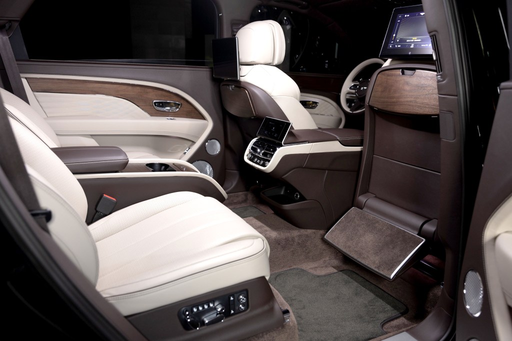 全新開發Bentley航空座椅套件可搭配4+1座或4座配置,多達22向調整功能之餘,在紓壓模式下座椅會以最大40度傾斜椅背,並自動展開地毯與皮革綴飾的休憩置腳踏板,商務模式則有較為直挺的座椅角度,提供愜意舒適的移動辦公室,VIP模式同時往前移動前座乘客位以求空間最大化,僅需透過後座觸控多功能遙控螢幕即能輕易轉換不同場景。