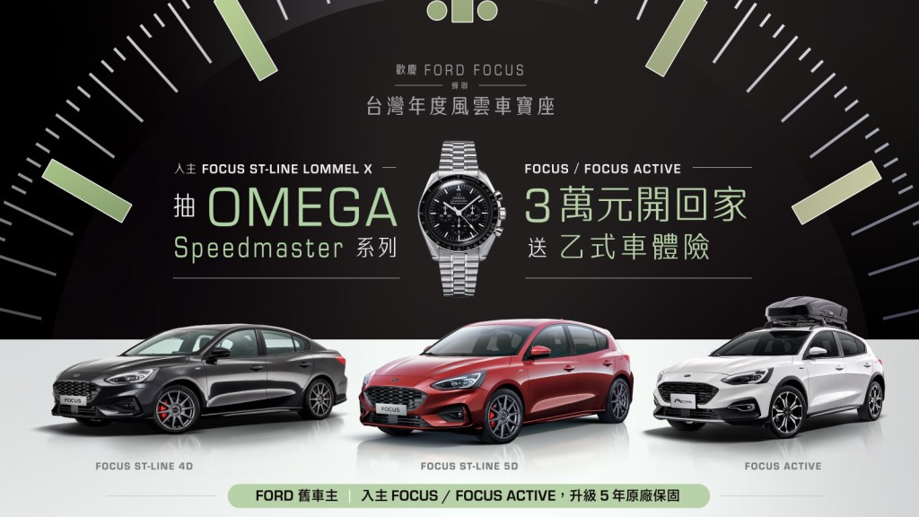 | Ford Focus | 1月1日至1月31日止 入主Focus/Focus Active,享3萬元開回家(首年月付5,888),加贈乙式險 舊車主換購Focus/Focus Active,再享五年原廠延長保固 入主Ford Focus ST-Line Lommel X,再具備「OMEGA Speedmaster 登月錶」抽獎資格 |